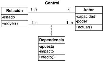 El diagrama está compuesto por la clase actor y la clase relación, vinculadas por asociaciones de control y dependencia. Los actores son las entidades del sistema que administran las relaciones mediante la modificación de los estados de las relaciones. Cada relación es controlada por un único actor, el único que es capaz de modificar su estado. El actor que controla una relación puede también depender de ésta. Cada actor asigna importancia (apuestas) a las relaciones de que depende, y obtiene, en consecuencia, un efecto de esta relación a través de una función de efecto aplicada al estado de la relación. Cada actor obtiene alguna capacidad de acción como agregación de las apuestas y los efectos que recibe de cada relación de la que depende; y algún poder, como una agregación de las capacidades de acción que el actor confiere a los actores que dependen de la relación que él controla.