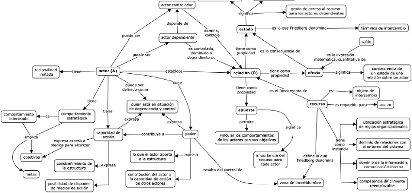Los elementos constitutivos de un modelo SocLab comprenden un conjunto de actores y de relaciones de control y de dependencia sobre las cuales aquéllos asignan distintos grados de importancia o apuestas. Estas relaciones tienen impactos sobre la capacidad de acción y sobre el poder de los actores. Por un lado, la capacidad de acción expresa la posibilidad de un actor de acceder al conjunto de recursos que requiere para alcanzar sus objetivos o, dicho de otro modo, la posibilidad de disponer de los medios necesarios para la acción. Por lo tanto, puede afirmarse que la capacidad de acción expresa los constreñimientos estructurales, es decir, lo que un actor recibe de un contexto de acción determinado.8 Por otro lado, el poder indica en qué medida un actor contribuye a la capacidad de acción de los otros actores por medio de las relaciones que él controla. Por lo tanto, el poder expresa lo que el actor aporta a la estructura de un sistema de acción.