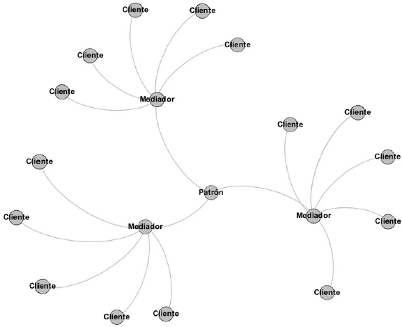 Esta estructura relacional del clientelismo político muestra un alto grado de concentración de relaciones en los mediadores que operan como hubs4 dentro de la red pero que dependen del patrón para integrarse entre ellos en una red mayor. Asimismo, el patrón opera estructuralmente como un puente local.5 Para que la relación clientelar persista en el tiempo y se adapte a los cambios en el contexto político y social, los tres roles que constituyen su estructura social básica, la tríada patrón-mediador-cliente, deben articularse. Es a partir de la interacción de estos tres roles que las redes clientelares emergen, organizan su funcionamiento, crecen incorporando (temporal o permanentemente) nuevos miembros y condicionan las conductas de sus miembros.