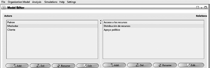 El primer paso consiste en crear el modelo de una organización (menú File → New Model). Enseguida, es necesario editar el modelo para definir los actores y los recursos (Organization Model → Model Editor). A partir del modelo teórico presentado en la sección precedente se han definido tres actores (patrón, mediador y cliente) y tres relaciones principales (acceso a los recursos, distribución de recursos y apoyo político) (figura 7). Ciertamente, podrían introducirse mayores matices conceptuales y analíticos con la finalidad de precisar otros recursos y relaciones. Sin embargo, aquí se opta por seguir el principio kiss (Keep it simple, stupid) (Axelrod, 1997) y construir el modelo de clientelismo más simple posible.
