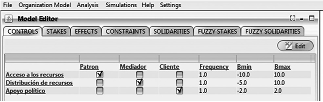 Ahora es preciso construir la matriz que asocia los actores y las relaciones con la finalidad de especificar qué actor controla cada relación (Organization Model → Parameters Editor). La primera solapa (Controls) presenta una tabla en cuyas columnas se encuentran los actores y en las filas las relaciones. Las marcas efectuadas en las celdas permiten definir al actor controlador y construir la matriz de asociaciones (figura 8): el “patrón” controla el acceso a los recursos; el “mediador” controla la distribución de los recursos, y finalmente, el “cliente” controla el apoyo político.