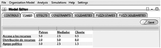 Siguiendo el diagrama de flujo presentado, debemos modelizar el grado de importancia que cada actor asigna a las relaciones en que se encuentra involucrado, en virtud de los objetivos que persigue (figura 9, solapa Stakes del editor de parámetros). Metodológicamente, cada actor dispone de 10 puntos para distribuir entre todas las relaciones. Cuanto mayor sea el valor asignado a una relación, mayor será su importancia.