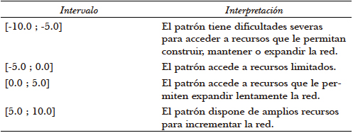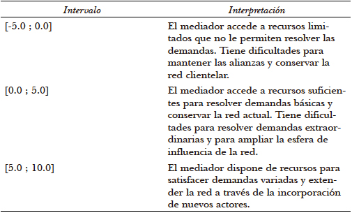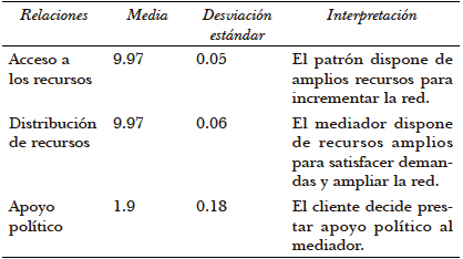 En las columnas de la matriz aparecen los actores y en las filas las relaciones. En las celdas se modelizan las ponderaciones que cada actor asigna a cada relación. La relación más importante para el patrón es la que él mismo controla: el acceso a los recursos, ya que en ello radica su principal medio de acción. Sin embargo, el patrón no puede desentenderse del modo en que los mediadores distribuyen los recursos (2 puntos) ni del apoyo político que recibe de los clientes (3 puntos), tarea cuya gestión es delegada en los mediadores. Para los mediadores, la mayor importancia radica en la distribución de recursos (5 puntos), ya que allí se juegan la construcción, el mantenimiento y el monitoreo del funcionamiento del nodo de la red que ellos controlan. Una importancia similar tiene para el mediador el acceso a los recursos que controla el patrón (2.5 puntos) -en los cuales se fundamenta su capacidad de acción- y garantizar el apoyo de los clientes que integran su nodo (2.5 puntos). Finalmente, en lo que concierne a los clientes, la relación más importante es acceder a los recursos que distribuye el mediador (8 puntos). Nótese que los clientes no tienen trato directo con el patrón y los recursos que gestiona, razón por la cual se le ha otorgado un valor menor (0.5). Por último, el apoyo político constituye el principal activo de los clientes, a los cuales se les ha asignado un valor de 1.5.