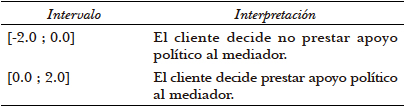 El actor que controla una relación dispone de un margen de maniobra para la gestión de un recurso correspondiente. Este margen está representado por el rango de valores que puede asumir el estado de una relación, definido por los parámetros Bmin y Bmax, cuyos límites son -10 y +10 respectivamente. Este rango o intervalo numérico permite caracterizar el espacio de comportamientos posibles que dispone el actor que controla una relación. El investigador puede reducir este intervalo para representar ciertos constreñimientos en la gestión de un recurso y limitar la libertad de acción de un actor. Por ejemplo, el cliente tiene un margen de maniobra reducido, ya que su libertad de acción se limita en la dinámica clientelar a brindar o no brindar apoyo político, lo que es representado por el intervalo -2 +2. Por su parte, el mediador tiene un límite inferior de -5, ya que el acceso a los recursos con los que gestiona la red no es ilimitado. Sin embargo, tiene cierta capacidad discrecional para distribuirlos, por lo que el límite superior es definido en +10. A continuación se documenta una interpretación teórica de los espacios de comportamientos modelizados para cada una de las tres relaciones: acceso a los recursos, distribución de los recursos y apoyo político (tablas 1, 2 y 3, respectivamente).