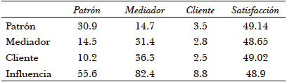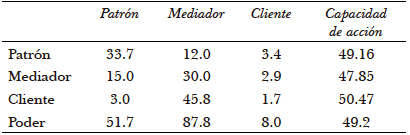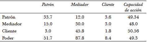 Las capacidades de acción de los patrones, mediadores y clientes no presentan grandes diferencias relativas (49.34, 48 y 50.56 respectivamente). Esto implica que cada actor tiene un grado de acceso similar a los recursos que más valora para su acción. Asimismo, se observan fuertes asimetrías de poder (51.7 para los patrones, 87.8 para los mediadores y 8.4 para los clientes). Los mediadores son el actor que más influye en la capacidad de acción de patrones y clientes y, por lo tanto, resulta un actor clave en la estructuración y el funcionamiento de la red. Por otra parte, los clientes son los actores más débiles, ya que pueden ejercer una influencia exigua en la capacidad de acción de los otros actores. Puede conjeturarse que esta debilidad está asociada con el grado de atomización de los clientes y con la falta de mecanismos de coordinación de una acción colectiva entre ellos.