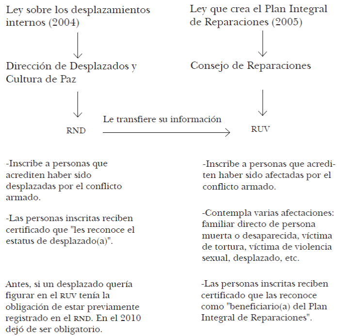 Segunda. La ausencia de antecedentes sostenidos sobre conteo de desplazados, así como la existencia de dos leyes de atención a éstos, se ha traducido, entre otras cosas, en una relación disfuncional entre el registro derivado de la Ley sobre los Desplazamientos Internos, a saber, el RND, y el registro derivado de la Ley que Crea el Programa Integral de Reparaciones, el RUV. Mientras que el primero es el repositorio oficial de información sobre desplazados, el segundo es el listado oficial de personas afectadas de diversas maneras por el conflicto armado, en el que se incluye también el desplazamiento. Esta disfuncionalidad en el trabajo de las instituciones respectivamente responsables de ambos registros ha contribuido a desvirtuar el sentido del RND dentro de la política de atención a desplazados por el conflicto armado.