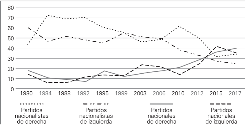 ¿Cómo se han desarrollado estas tendencias hasta las elecciones de 2017? Para responder a esta cuestión, veremos cómo las decisiones de los actores se han dado dentro de la identidad de cada uno de los bloques a los que pertenecen, y su relación con el comportamiento de los electores catalanes, diferente cuando se trata de votar en elecciones nacionales o en autonómicas; aquí sólo trabajamos sobre las segundas. A lo largo de este recorrido, articulado en los mencionados bloques, observamos que entre las decisiones de los actores, la fundamental ha sido la de propiciar un cambio de marco por el que el clivaje derecha-izquierda ha dejado de ser central a favor del nacionalismo planteado en términos maximalistas: independencia o no, lo que no contemplan los cauces institucionales.