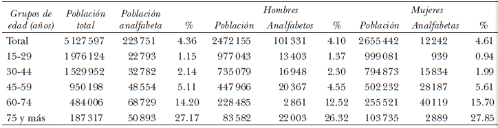 Las políticas educativas en México lograron, a lo largo del siglo XX , que la proporción de la población analfabeta sea hoy una minoría. Para 2010 representaba 6.9% de la población mayor de 14 años a nivel nacional, y en Jalisco2 era el 4.4%3 (INEGI, 2011). Aunque porcentualmente se haya reducido el analfabetismo, el número de personas que viven en estas condiciones no es pequeño (5 960 173 personas a nivel nacional y 251 252 en Jalisco),4 muchas de las cuales son personas mayores de 50 años. De hecho, habría que considerar que las políticas para atender el analfabetismo están enfocadas básicamente en la reducción porcentual de las personas que no saben leer ni escribir que se encuentran en edad “productiva” (menores de 45 años), pero poco se enfocan en otros requerimientos, incluso de tipo laboral, de quienes viven en dicha condición, lo que frecuentemente lleva a que a esta parte de la población, junto con las problemáticas que tiene -en cuanto a sus necesidades, dificultades y requerimientos sociales- se le considere postergable o inexistente, con lo que se profundiza la exclusión de estos sectores que generalmente viven en condiciones de pobreza, y aun cuando tienen edades avanzadas, siguen teniendo necesidades.5