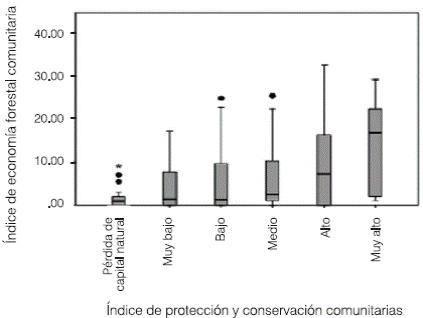 La práctica de actividades de protección y conservación de los bosques guarda una relación significativa con el desarrollo de la economía forestal comunitaria. Las comunidades con mayor control de la producción y autonomía en el manejo de los bosques tienden a invertir mayores esfuerzos en actividades de protección y conservación forestales.