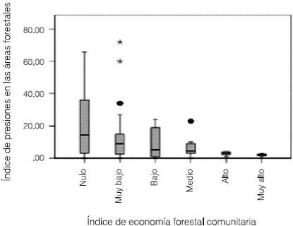 Contra lo que suele suponerse, los datos de este trabajo muestran que las presiones en los bosques tienden a disminuir considerablemente en la medida en que la economía forestal comunitaria se desarrolla, mientras que las presiones más intensas y variadas se experimentan en las áreas forestales donde no se llevan a cabo actividades forestales generadoras de beneficios económicos. Esta información sugiere que en la medida en que los incentivos, conocimientos y capacidades técnicas comunitarias son mayores, como resultado de una economía forestal local más desarrollada y diversa, los miembros de las comunidades cuentan con mayor capacidad para detectar presiones en los bosques y reconocer su presencia antes de que sus impactos se incrementen. Adicionalmente, todos los casos donde se reportaron procesos de deforestación recientes ocurrieron en bosques comunitarios donde no se lleva a cabo ninguna actividad económica a partir del uso de recursos forestales.