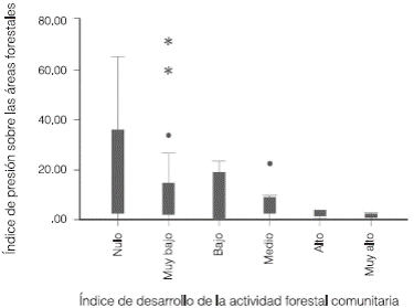 La “dependencia” de los recursos forestales fue planteada por Ostrom como importante para el valor social que se confiere a los bosques y los incentivos para asumir compromisos con su gobernanza y conservación. El índice de desarrollo de la economía comunitaria forestal busca documentar el nivel de dependencia. En 69% de las comunidades de la muestra el desarrollo de la economía forestal es “muy bajo”. En la mitad de las comunidades de este subgrupo se cosechan y venden productos forestales no maderables como hongos, resinas y plantas medicinales. Las personas y las familias que llevan a cabo estas actividades se encuentran entre los miembros más pobres de las comunidades. Esta cosecha genera escasas ganancias, debido a la ausencia de valor agregado y a un fuerte control del mercado por parte de intermediarios. El resto de las comunidades de este subgrupo sólo obtiene de los bosques leña para el uso doméstico.