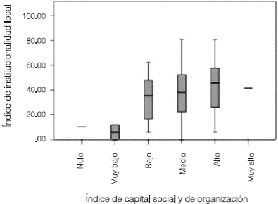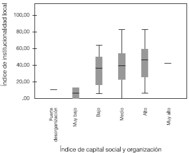 La institucionalidad se incrementa generalmente en función del nivel de organización y capital social. La organización y el capital social facilitan y sustentan el desarrollo de institucionalidad comunitaria, pero a la vez la presencia de instituciones sólidas fortalece la organización y la confianza. No obstante, capital social e instituciones comunitarias no son equivalentes; el desarrollo de institucionalidad demanda esfuerzos específicos, como expresa la presencia de un pequeño número de comunidades en la muestra con los más altos niveles de organización e institucionalidad comunitaria con solidez “intermedia”.