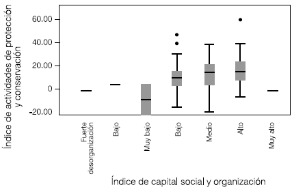 El desarrollo de actividades de protección y conservación depende en gran medida de la organización y del capital social presente en las comunidades. Como tendencia general, en las comunidades con organización y capital social mayores las tareas de protección y conservación son más frecuentes y diversas, mientras que en las comunidades con débil organización estas actividades son limitadas. Este patrón expresa la necesidad de organización social para realizar actividades de protección y conservación que demandan coordinación y acción colectiva. Sin embargo, encontramos en la muestra un reducido número de comunidades con débil organización y capital social que afirmaron realizar este tipo de acciones con fuerte intensidad. Este dato puede explicarse a partir de los subsidios gubernamentales a la reforestación, una de las variables consideradas en el índice de actividades de protección y conservación. También encontramos el caso opuesto: un pequeño número de comunidades con fuerte organización que sólo llevan a cabo actividades de protección forestal de manera muy limitada. Las comunidades se organizan con diversos propósitos que pueden o no coincidir con la conservación del bosque. La organización social es una condición importante para la implementación de prácticas de conservación de los bosques comunitarios, pero se requiere contar con incentivos coherentes con el desempeño de estas prácticas y medidas.