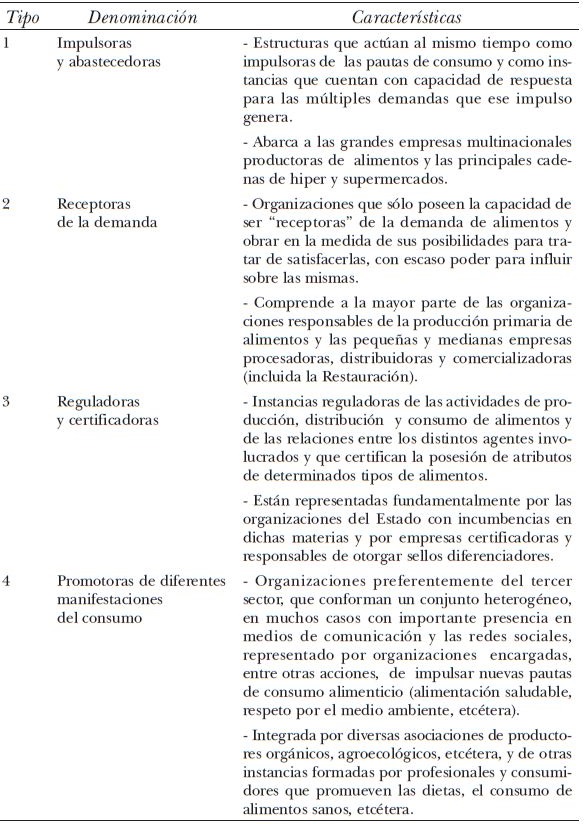 Los tres primeros grupos han asumido características más específicas desde la segunda mitad del siglo pasado, con la consolidación de los grandes complejos agroindustriales y de la gran distribución a nivel global; en cambio, la creciente importancia de las organizaciones que conforman el cuarto grupo está directamente vinculada con el desarrollo más reciente de gran parte de las temáticas que se han señalado como objeto de estudio de la sociología de la alimentación aquí esbozadas.
