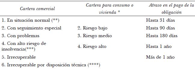 Según la comunicación A 2729 del Banco Central de la República Argentina (en adelante BCRA), todas las entidades del sistema financiero se encuentran obligadas a clasificar a sus clientes “en orden al cumplimiento de sus compromisos y/o posibilidades que a este efecto se les asigne sobre la base de una evaluación de su situación particular” (BCRA, 1998). El sistema de clasificación consta de hasta seis categorías formuladas con base en identificar el riesgo con el atraso en el pago de la obligación.