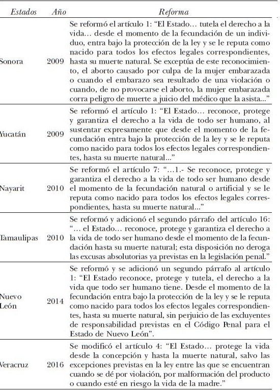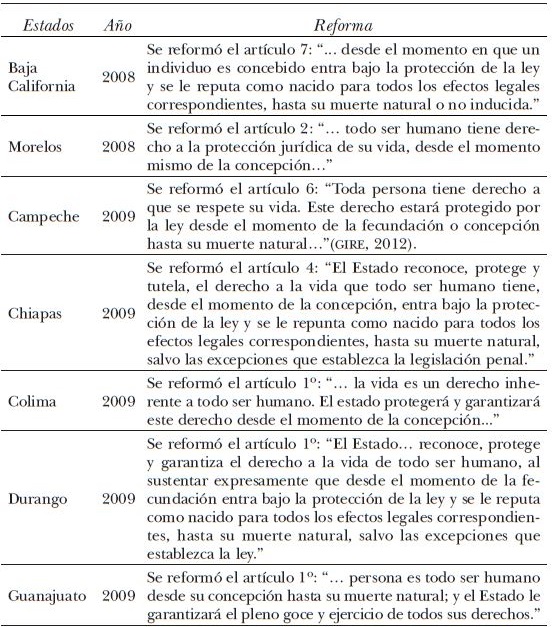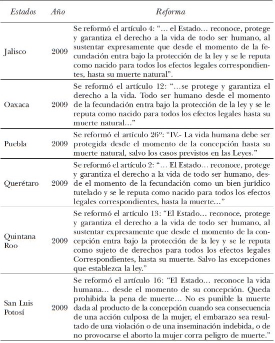 Entre 2008 y 2014 quedó en evidencia el ejercicio diferenciado de la laicidad en el territorio nacional, un problema añejo que, más allá de las leyes, involucra a la cultura política de las distintas entidades. Desde 2008, la amplia coalición conservadora desplegó una estrategia que involucró a 18 legislaturas estatales, en las que se fueron aprobando cambios constituciones contra el proceso de despenalización del aborto, y con ello se ejerció presión sobre la forma de gobierno federalista. La forma como quedaron redactados los cambios en cada legislatura tenía matices, pero en todos los casos se consagraba el respeto a la vida desde la concepción hasta la muerte natural. En la mayoría de los congresos locales los procesos legislativos se caracterizaron por la ausencia de debate, se resolvió a partir de votaciones económicas sobre propuestas previamente acordadas por los líderes de las fracciones parlamentarias del PRI y el pan (véase el cuadro 1, en el Anexo).