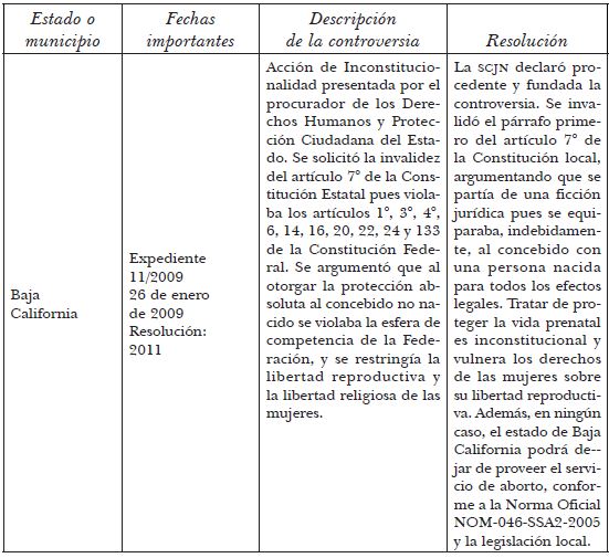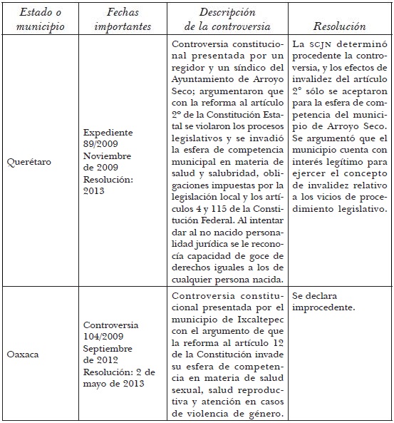 Posteriormente, en mayo de 2013 -una vez que ya se había aprobado la inclusión de la laicidad como rasgo de la República-, la SCJN desecharía las controversias constitucionales iniciadas por los municipios de Asunción Ixtaltepec, Oaxaca, presentada en septiembre de 2009, y de Uriangato, Guanajuato, interpuesta en septiembre de 2012 (Aranda, 2013b). En ambos casos se alegó que los congresos respectivos invadían la esfera de competencia de la alcaldía en materia de salud reproductiva e igualdad, e impedían aplicar la Norma Oficial Mexicana 046 sobre violencia familiar, sexual y contra las mujeres, que obliga al personal del sistema de salud a proporcionar métodos anticonceptivos de emergencia, informar sobre las opciones para interrumpir un embarazo en caso de violación y a ofrecer los servicios de salud reproductiva y planificación familiar. La Corte declaró improcedentes ambas controversias, al no encontrar elementos sobre la invasión de competencias.