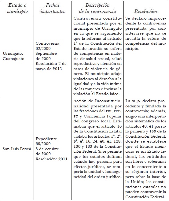 Si estamos de acuerdo en que la laicidad también se construye a partir de la conciencia histórica del conflicto potencial que puede generar la disputa de espacios a una visión absolutista de la fe (Rimoli, 2007: 247), los conflictos derivados de la despenalización del aborto en la capital del país mostraron que las élites políticas de varias entidades consideraban un costo menor las tensiones que provocarían la defensa de sus creencias como fieles católicos. Fueron los propios legisladores quienes sometieron a presiones el ejercicio de gobierno y la administración de los servicios públicos relacionados con la salud reproductiva, al priorizar el influjo de la moral religiosa en el contenido de las leyes locales. Así, en cuanto se dieron las primeras reformas a las constituciones locales para detener la despenalización del aborto, en Baja California y Morelos, también se fue articulando una reacción en contra por parte de ciertos actores políticos que interpusieron controversias constitucionales o acciones de inconstitucionalidad, con lo que denunciaron las tensiones sobre el pacto federal (véase el cuadro 2, en el Anexo). Esto obligó a la SCJN a abrirse a la reflexión en cuanto a si los estados de la República podían legislar en materia de aborto, a pesar de que, desde el momento que los ministros habían avalado la constitucionalidad de la reforma en el Distrito Federal, de facto reconocieron la facultad del resto de las entidades del país de legislar en materia de interrupción legal del embarazo.