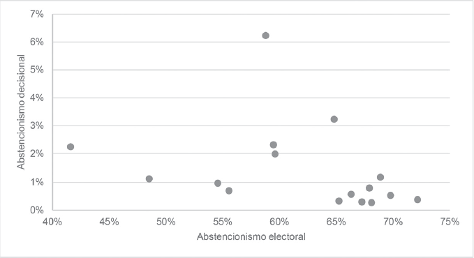 Por otro lado, “también es posible problematizar el abstencionismo desde una tensión entre la participación electoral y la decisión electoral” (Soto y Giraldo, 2016: 251), entendiendo que el abstencionismo decisional es el resultado de los ciudadanos que expresan diferentes intensidades de decisión aunque compartan iguales intensidades de participación, como sucede con las elecciones legislativas y locales en Colombia. Lo anterior significa que todos los electores expresan la misma intensidad de participación porque el voto está pensado en términos categóricos, aunque al escoger entre las tres o cuatro autoridades las intensidades de decisión cambian entre un elector y otro.