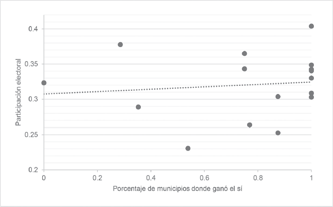 Al analizar el porcentaje de municipios donde ganó el “Sí” la participación electoral, se advierte que hay una correlación positiva entre ambos; es decir, la participación electoral fue más alta en aquellas CTEP en donde el porcentaje de municipios en los que ganó el “Sí” fue mayor (véase Gráfica 5).
