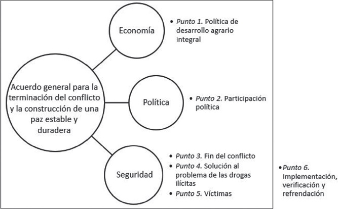 La paz colombiana debe partir del reconocimiento sistémico e integral sobre la misma; en ese sentido, la paz no solamente está pensada para disminuir la violencia y superar la guerra. El actual proceso de paz en Colombia también apuesta a la consolidación de una economía de mercado y un fortalecimiento del sistema democrático (véase Figura 1). El Acuerdo de Paz contiene seis puntos, de los cuales dos están claramente vinculados con la dimensión democrática: el 2, sobre la participación política, y el 6, sobre la refrendación que se materializó a través del Plebiscito por la Paz celebrado el 2 de octubre de 2016, que concluyó a favor del “No” avalar los acuerdos, con una votación muy justa.3