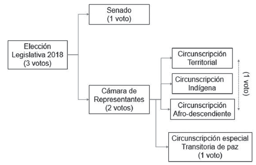 El voto único o categórico se refiere al acto donde cada elector tiene un voto (Nohlen, 1995); para el caso colombiano, en las elecciones legislativas el elector sólo posee un voto (1) para elegir el Senado y un voto (1) para elegir la Cámara de Representante; en el caso de las CTEP, un voto (1) más para elegir representantes a la Cámara de Representantes (en 16 circunscripciones uninominales); sin embargo, se opera como un voto múltiple porque el elector posee tantos votos como autoridades están en disputa; por lo tanto, los niveles de respaldo pueden variar entre las autoridades por escoger, aunque el nivel de participación electoral siga siendo el mismo.