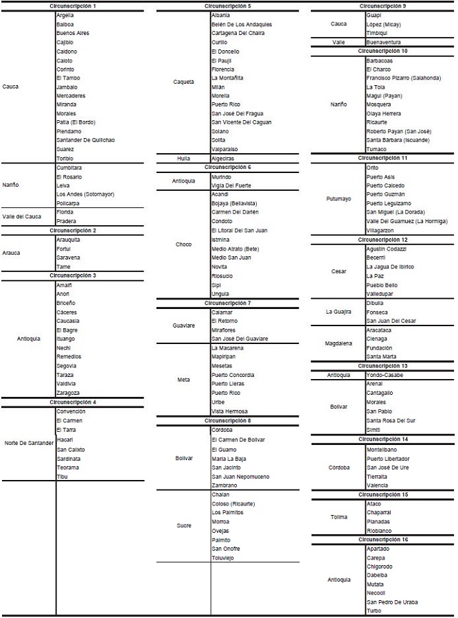Se puede advertir que las circunscripciones con un padrón electoral superior a los 300 000 electores contienen municipios muy poblados que podrían concentrar la votación y generar intensidades diferentes de electores, que provocarían a su vez intensidades distintas en la búsqueda de votos, con la consecuente discriminación y focalización de votos en los municipios más poblados. Estos municipios son Caucasia, Turbo, Apartado (CTEP 3 y 16, municipios del Departamento de Antioquia), Florencia (CTEP 5, municipio del Departamento del Caquetá), Tumaco (CTEP 10, municipio del Departamento de Nariño), Buenaventura (CTEP 9, municipio del Departamento del Valle del Cauca), Santa Marta y Ciénaga (CTEP 12, municipios del Departamento del Magdalena), y Valledupar (CTEP 12, municipio del Departamento del Cesar).
