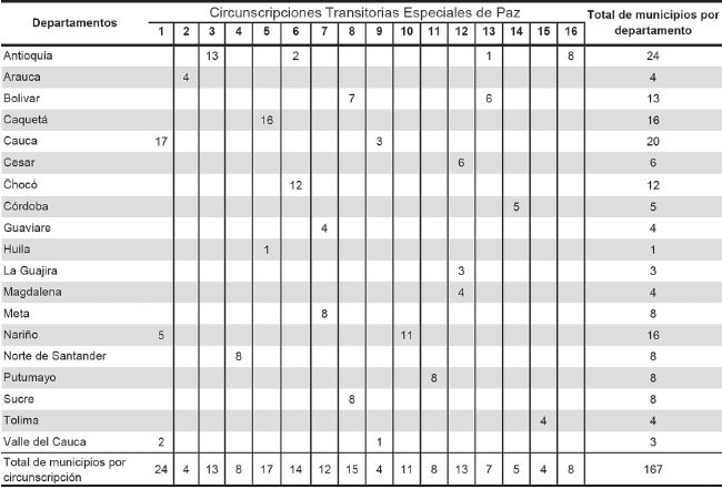 Las CTEP agrupan un total de 167 municipios contenidos en 19 departamentos. Destaca Antioquia como el departamento que contiene más municipios, 24 en total distribuidos en las CTEP 3, 6, 13 y 16; lo sigue el Departamento del Cauca, con 20 municipios distribuidos en las CTEP 1 y 9. En el otro extremo, el Departamento del Tolima contiene cuatro municipios en la CTEP 15, y el Departamento del Valle del Cauca tiene dos municipios en la CTEP 1 y un municipio en la CTEP 9 (véase Tabla 2): Adicionalmente, la totalidad de los municipios de los departamentos de Caquetá y Guaviare están contenidos en las CTEP 5 y 7. Esto refleja la severidad del conflicto armado en dichos departamentos.