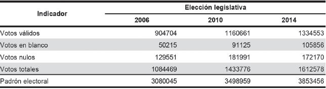 En términos agregados, de 2010 respecto a 2006: los votos aumentaron más que el incremento del padrón electoral; los votos válidos aumentaron 28%; el voto en blanco prácticamente se duplicó, pues tuvo un incremento de 80%. Por otro lado, de 2014 respecto a 2010: todos los votos -a excepción de los nulos- aumentaron más que el incremento del padrón electoral; los votos válidos aumentaron 15%; el voto en blanco aumentó 16%, y los votos nulos disminuyeron 5% (véase Tabla 4), de modo que, en términos agregados, la tendencia apunta a una mejora en los niveles de participación electoral como resultado del aumento del control y la presencia estatal en dichos departamentos; aunque es oportuno reconocer que las capacidades estatales siguen siendo limitadas y la participación electoral constreñida.