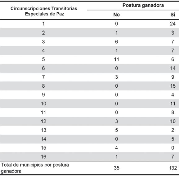 Aunque el número de municipios a favor y en contra de la paz es importante para identificar apoyos desagregados, en el caso de las circunscripciones electorales lo significativo es identificar el apoyo expresado en porcentaje de votos; desde esta perspectiva, el panorama en todo el territorio (no valorado por municipios) es más favorable para la paz. En términos agregados, el “Sí” obtuvo 64.1% de las CTEP, ganando en 14 de las 16 CTEP, y en algunos casos de manera muy destacada.