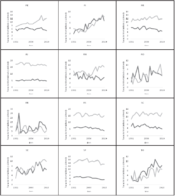 A análise foi realizada a partir de dados agregados por estados brasileiros entre os anos de 1991 e 2010, correspondendo a um intervalo de 20 anos, cujo início e término se dão em anos censitários. Isto permitiu a obtenção, além dos dados de mortalidade para todos os anos, a informação sobre o desenvolvimento humano e demais indicadores socioeconômicos utilizados.