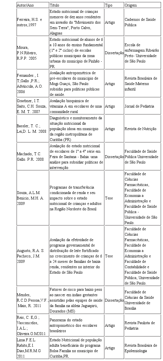 Os critérios de inclusão no presente estudo foram: artigos, teses e dissertações publicados que utilizaram a avaliação do estado nutricional no acompanhamento das políticas públicas.