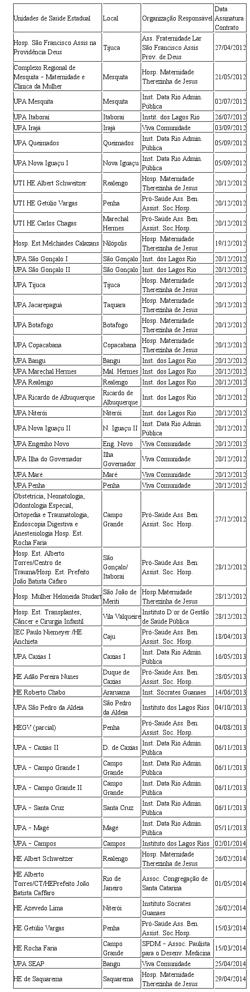 A Fundação Estatal dos Hospitais Gerais manterá em sua estrutura as seguintes unidades hospitalares:I –Hospital Regional de Barra de São João (Barra de São João); II – Hospital Estadual Carlos Chagas; III –Hospital Regional de Araruama;V –Instituto Estadual de Doenças Ary Parreiras (Niterói); VI – Hospital Estadual Santa Maria. A Fundação Estatal dos Hospitais de Urgência manterá em sua estrutura as seguintes unidades hospitalares:I – Hospital Estadual Getúlio Vargas;II – Hospital Estadual Carlos Chagas;III – Hospital Estadual Rocha Faria;IV –Hospital Estadual Pedro II;V – Hospital Estadual Albert Schweitzer;VI – Hospital Estadual Adão Pereira Nunes;VII – Hospital Estadual Azevedo Lima;VIII – Hospital Estadual Alberto Torres. A Fundação Estatal dos Institutos e da Central Estadual de Transplante manterá em sua estrutura as seguintes unidades hospitalares:I – Instituto Estadual de Hematologia Arthur Siqueira Cavalcanti;II – Instituto Estadual de Cardiologia Aloysio de Castro;III – Instituto Estadual de Diabetes e Endocrinologia Luiz Capriglione;IV – Laboratório Central de Saúde Pública Noel Nutels;V – Central Estadual de Transplantes. (RIO DE JANEIRO, 2007).