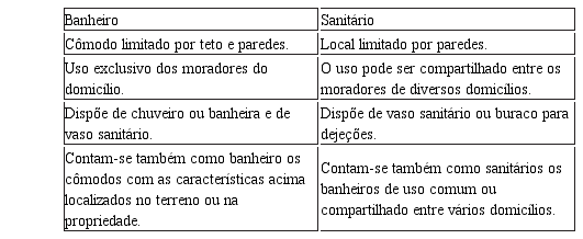 Essa observação é importante em razão de que este trabalho utilizará dados do IBGE, que, por sua vez, distingue banheiros e sanitários em termos de compartilhamento, como pode ser verificado no Quadro 2.
