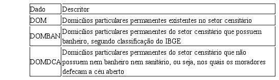 Visando fazer frente ao objetivo descrito no parágrafo anterior, para cada censo, utilizaram-se os microdados da categoria universo, no grupo referente às características dos domicílios, desagregados no nível de setor censitário. Este é o menor nível de desagregação possível no censo, e foi utilizado em razão de permitir qualquer nível de agregação no território nacional (por Região, UF, etc.).