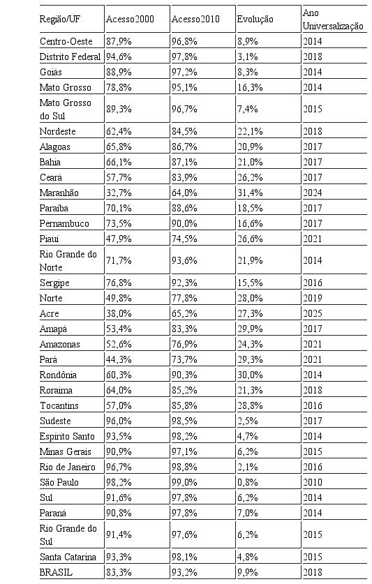 Na Tabela 1, é possível verificar – por região, UF e em todo o território nacional – o percentual de domicílios com acesso a banheiros, a evolução percentual na década e o ano estimado de universalização do acesso, considerando a taxa de aumento do acesso na década.