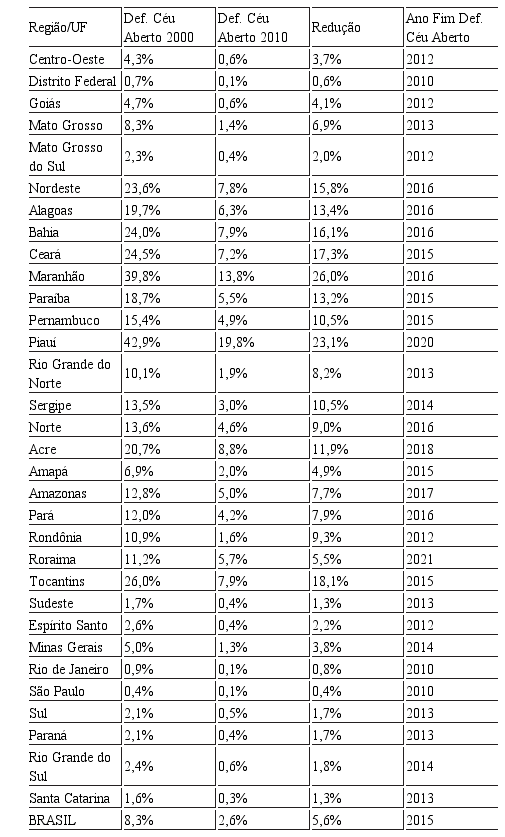 Segundo os dados dispostos na Tabela 2, 2015 figura como o ano de fim de defecação a céu aberto no Brasil, mantido o ritmo da década de 2000 a 2010. No entanto, as desigualdades no território continuam a mostrar- se, ainda que menos elevadas do que aquelas verificadas na Tabela 1.