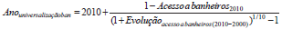 O indicador Evoluçãoacesso a banheiros (2010-2000) resulta em uma taxa de evolução no acesso a banheiros na década. Para calcular o ano em que determinado território universalizará o acesso a banheiros, utilizou-se a fórmula5 abaixo.