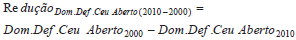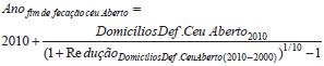 O indicador ReduçãoDom.Def.Ceu Aberto(2010-2000) resulta em uma taxa de redução de domicílios nos quais os moradores defecam a céu aberto, referente à década de 2000 a 2010. Para calcular o ano em que determinado território porá fim à defecação a céu aberto, utilizou-se a fórmula8 abaixo: