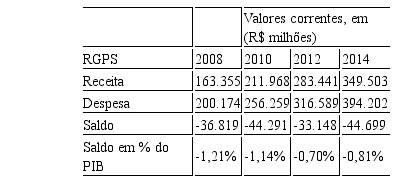 Verifica-se, por meio da Tabela 1, que a execução orçamentária do RGPS obteve um crescimento de 97%, se comparado os valores de 2014 (R$ 394,2 bilhões) em relação a 2008 (R$ 200,1 bilhões). Em 2014, por exemplo, o RGPS obteve uma arrecadação de R$ 349,5 bilhões, considerando apenas as receitas de contribuições previdenciárias, em contrapartida a um total de despesas de R$ 394,2 bilhões, o que gerou um saldo negativo de quase R$ 44,6 bilhões.