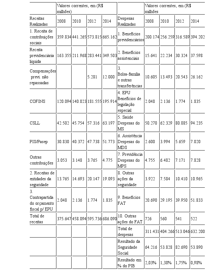 ASSOCIAÇÃO NACIONAL DOS AUDITORES FISCAIS DA RECEITA FEDERAL DO BRASIL. Análise da Seguridade Social em 2014: tabelas. Brasília, DF, 2016.