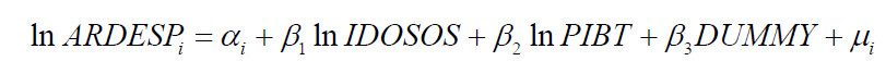Em que ARDESP se refere à relação entre arrecadação e despesa previdenciária total; IDOSOS, população idosa com idade igual ou superior a 65 anos, por município; PIBT, Produto Interno Brut do município considerado, mensaurado em R$ mil; DUMMY = 0, caso o município apresente arrecadação previdenciárias, e um, caso contrário; Ln, Logaritmo natural; i = indica o município considerado; 2015), algebramente, o modelo empregado neste artigo pode ser representado pela equação ai = ln b0 b1, b2 , b3, parâmetros a serem estimados; e m, Erro estocástico.