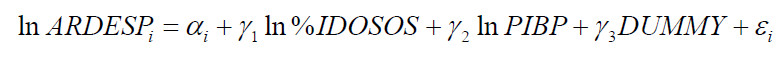Em que: ARDEP, conforme descrito, diz respeito à relação entre arrecadação e despesa previdenciária total; % IDOSOS, represneta a proporção de idosos com idade igual ou superior a 65 anos, por município; PIBP, Produto Interno Bruto per capita, mensurado em RS; DUMMY = 0, caso o município apresente arrecadação previdenciária, e um, caso contrário; i indica o município considerado; ai = ln γ0; y1 y2 y3 γ1γ 2γ3, parâmetros a serem estimados; e e, erro estocástico.