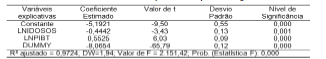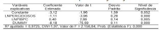 Pode-se inferir ainda que 97,29% das variações ocorridas na relação entre arrecadação/despesa previdenciária são explicadas pela proporção de idosos, PIB per capita e pela variável Dummy.