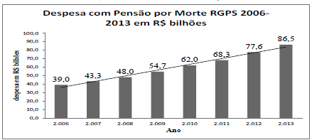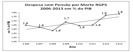 Ademais, ressalta-se que a despesa bruta com a pensão por morte aumentou de 39 bilhões em 2006 para 86,5 bilhões em 2013, ultrapassando o dobro da cifra original no período de tempo avaliado. Isto é, houve uma alta de 121,5% no decorrer de sete anos, o que representa mais ou menos 12% a cada 12 meses (Gráfico 1). Com relação ao PIB, houve o aumento de pagamento só em pensões de cerca 1,6% em 2006 para 1,8% em 2013 somente no RGPS (Gráfico 2). A quantidade de pensões concedidas passou de 5,9 milhões em dezembro de 2005 para 7,4 milhões em outubro de 2014. Ocorreu, praticamente, um acréscimo de 1,5 milhões, sendo que a média de duração dos benefícios cessados alterou-se de 13 anos em 1999 para 16 anos em 2012. Por ora, é informado que essas pensões tiveram uma duração média de 35 (trinta e cinco) anos ou mais e que “[...] o incremento da despesa por si só não é um problema, quando representa maior nível de proteção, mas certamente não é recomendável quando decorre de regras inadequadas de concessão e também pressiona a carga tributária.” (ALVES FILHO; BELCHIOR; MANTEGA, 2014, p. 2).