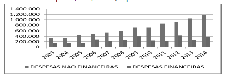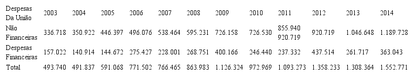 Gastos com despesas financeiras e não financeiras da União excluídos os valores do refinanciamento da dívida, em R$ milhões, no período 2003-2014