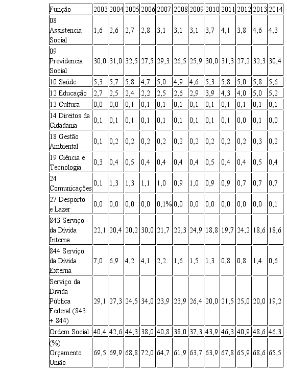 No governo Dilma (2011-2014), a participação dos gastos sociais no orçamento da União não cresceu (estável em 46,3%), como pode ser visualizado na Tabela 3. As áreas sociais mais afetadas com a redução de gastos foram: direitos da cidadania com 45,2%, ciência e tecnologia 13,4%, saúde 3,6% e previdência social com 2,9%. No entanto, outras despesas sociais cresceram sua participação, principalmente, desporto e lazer 91,6%, comunicações 32,3%, educação 22,5% e assistência social 6,2%.