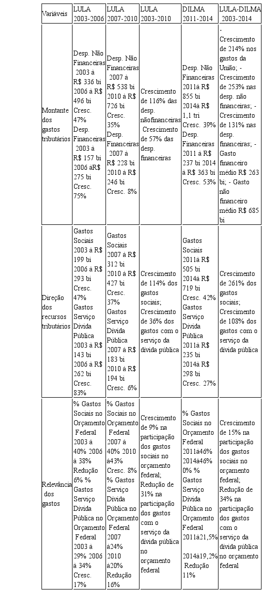No que diz respeito ao montante dos gastos tributários financeiros e não financeiros, as despesas não financeiras foram as mais representativas. Aportaram R$ 685 bilhões por ano, o que significou uma participação média de 72% dessa despesa no total dos gastos federais anuais no período de 2003-2014. No entanto, o crescimento mais acelerado das despesas financeiras, em dois, dos três períodos analisados, sinalizaram um maior direcionamento dos recursos tributários para os gastos financeiros no primeiro governo Lula e no governo Dilma.