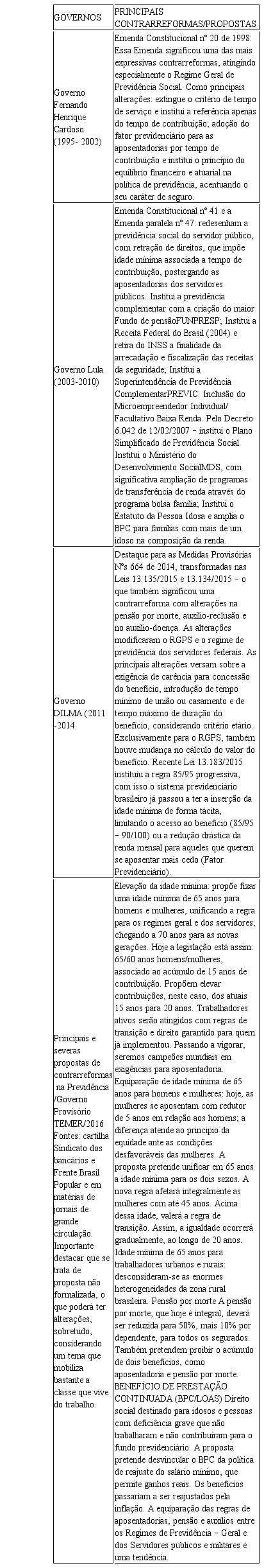 No intuito de contribuir com reflexões sobre a temática, registramos abaixo quadro-síntese com as principais contrarreformas operadas no Brasil contemporâneo, apontando tendências/impasses/ propostas que estão sendo veiculadas, que, em se confirmando, representará uma profunda precarização dos direitos previdenciários e desmontará a estrutura constitucional da política de previdência publica no Brasil. Importante destacar que a base de sustentação para tamanho desmonte está em plena tramitação de aprovação no Senado, com o PEC nº 55/2016 (Senado) e PEC nº 241 (Congresso). Também denominada pelos movimentos sociais de luta e resistência PEC da morte, PEC da desigualdade.