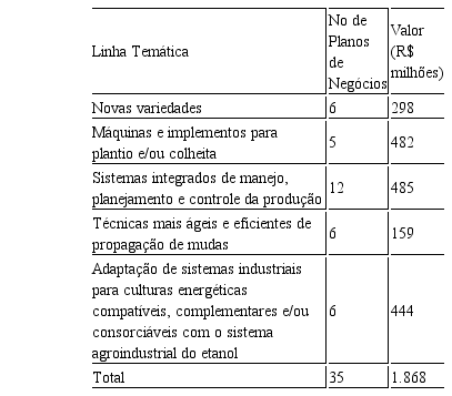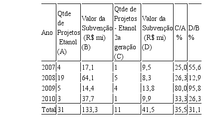 Por sua vez o Programa de Subvenção Econômica da FINEP foi lançado em 2006 e significou uma ação pioneira no país. No que se refere ao segmento sucroalcooleiro, verificaram-se algumas operações de financiamento entre 2007 e 2010, sendo o edital de 2010 o último a registrar demanda específica para plantas-piloto para obtenção de etanol de segunda geração a partir de biomassa.Após esse período houve um deslocamento de todos os financiamentos não reembolsáveis para o âmbito do PAISS (programa em parceria com o BNDES). A Tabela 1 mostra que entre 2007 e 2010 foram contratados 31 projetos relacionados ao uso da cana-de-açúcar com finalidades energéticas, ao custo total de R$ 133,3 milhões. Contudo, nem todos esses projetos estavam voltados ao desenvolvimento de biocombustíveis. Assim, apesar de se referir ao uso da cana-de-açúcar ou de sua biomassa, muitos deles se referiam à produção de energia elétrica ou processos de plantio e colheita. Destaca-se que foram contratados 11 projetos diretamente associados ao etanol de segunda geração, totalizando R$ 41,5 milhões ou 31,1% do total financiado.